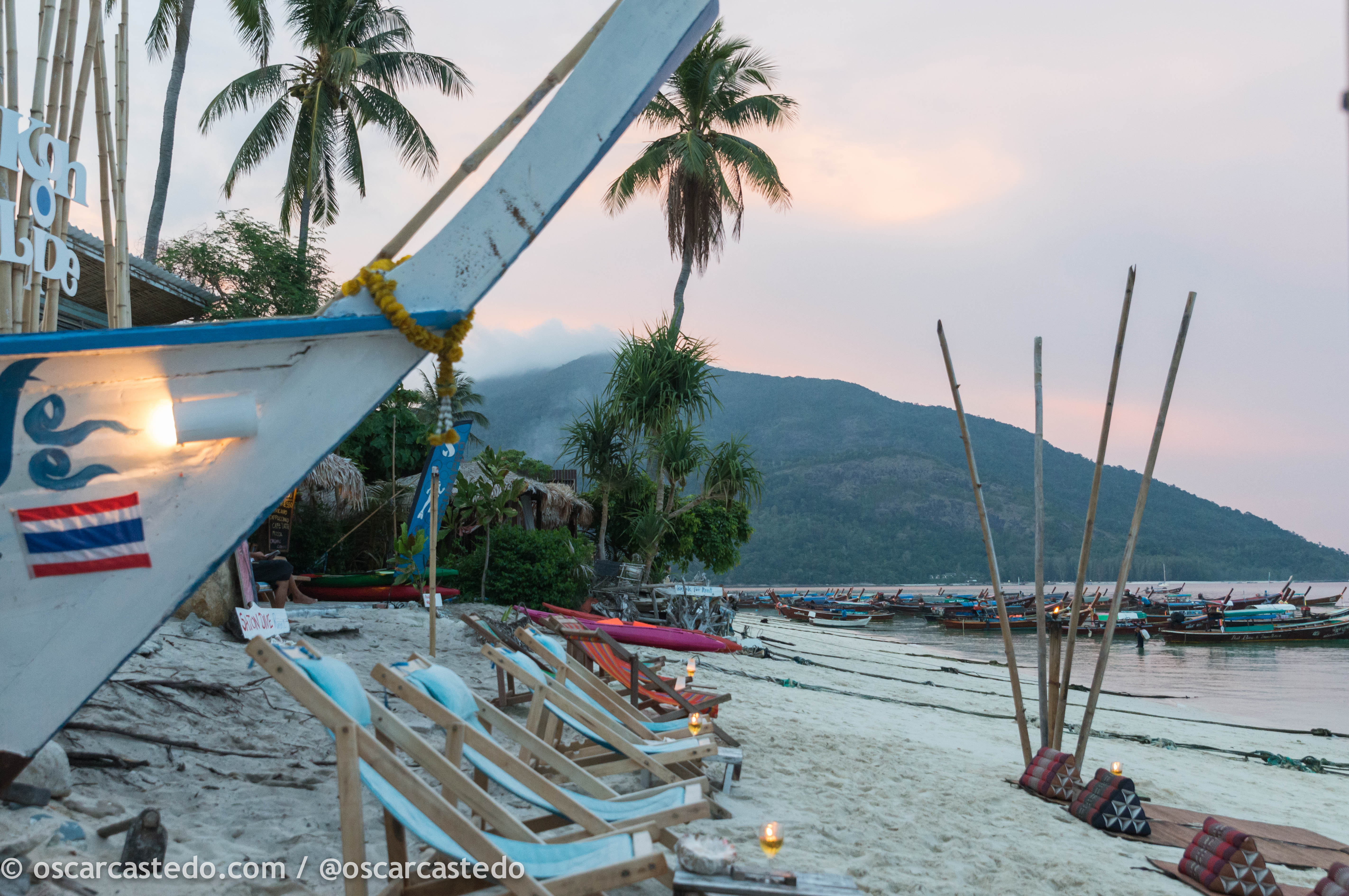 que te llevarán en los taxi-boats de los habitantes de la isla (conocidos como los gitanos del mar). Alquileres de kayaks con los que puedes recorrer la isla. Masajes, a 300THB la hora, algo inevitable para relajar todos los músculos del cuerpo. La tranquilidad contemplando el mar y el balanceo de los barcos, os recomiendo el “Happy Vibe” en la Sunrise Beach, un zumo o una Leo/Tiger/Singha y tumbarse en la arena.